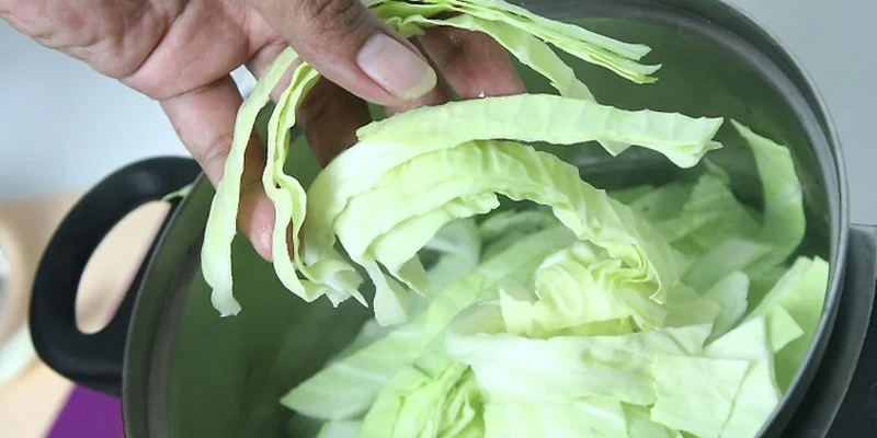 - Thả bắp cải đã sơ chế vào, đảo nhẹ.