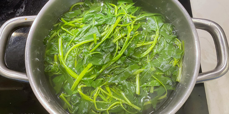 - Cho rau muống vào nồi, luộc ở lửa lớn từ 2–3 phút.